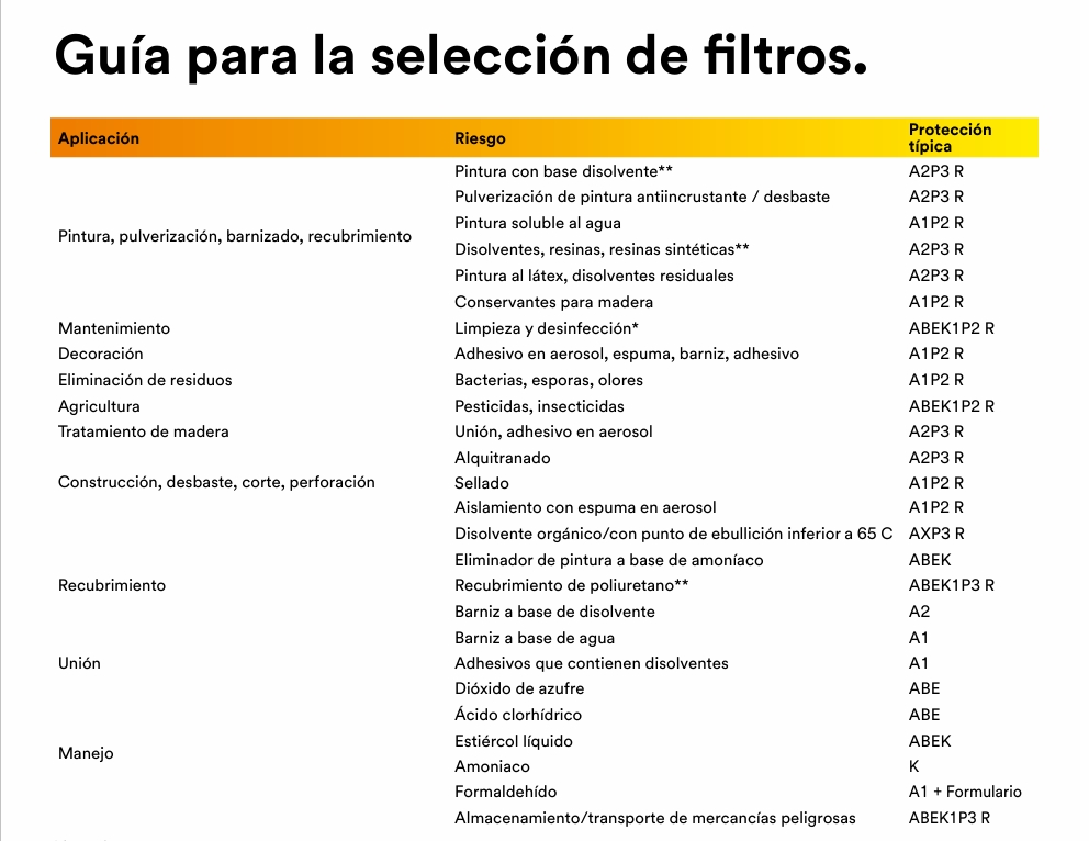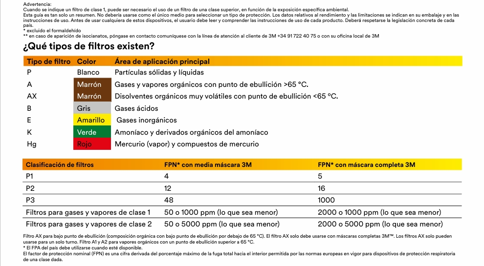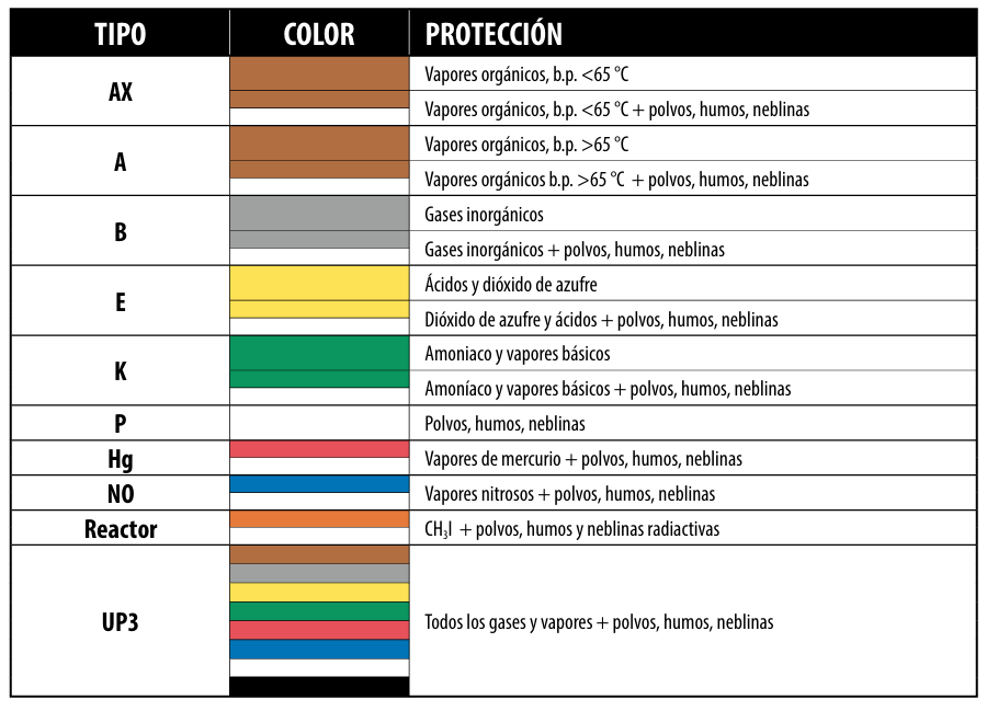 El filtro antipolvo está indicado con la letra P seguida de un numero 1,2,3 según su eficacia de filtración. Cada tipo de filtro está identificado por un color para reconocerlos. Junto a los conceptos básicos ilustrados a continuación están disponibles filtros considerados polivalentes, que proporcionan la protección de varias clases fundamentales al mismo tiempo (ejem. AB, BK, ABEK).