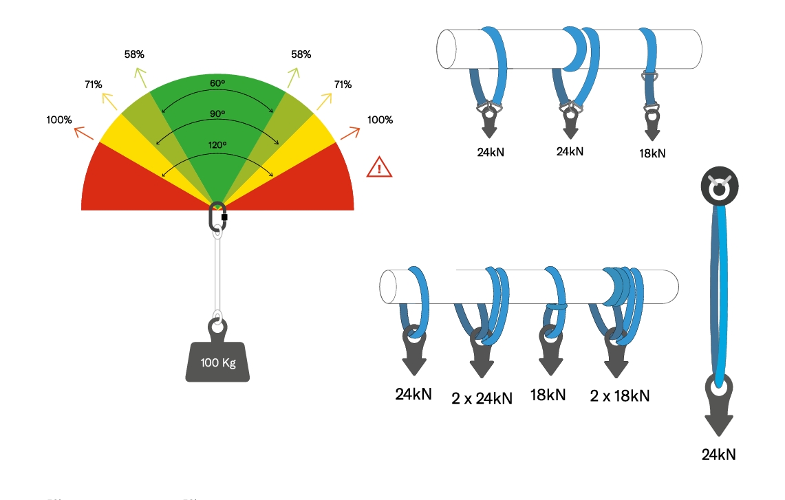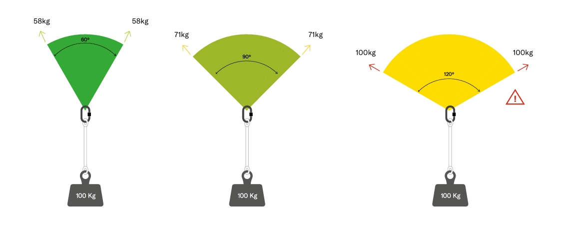 Cuando instalamos diferentes dispositivos de anclaje es importante tener en cuenta el ángulo entre ellos. Cuanto más grande el ángulo, mayores serán las fuerzas transmitidas a los anclajes.