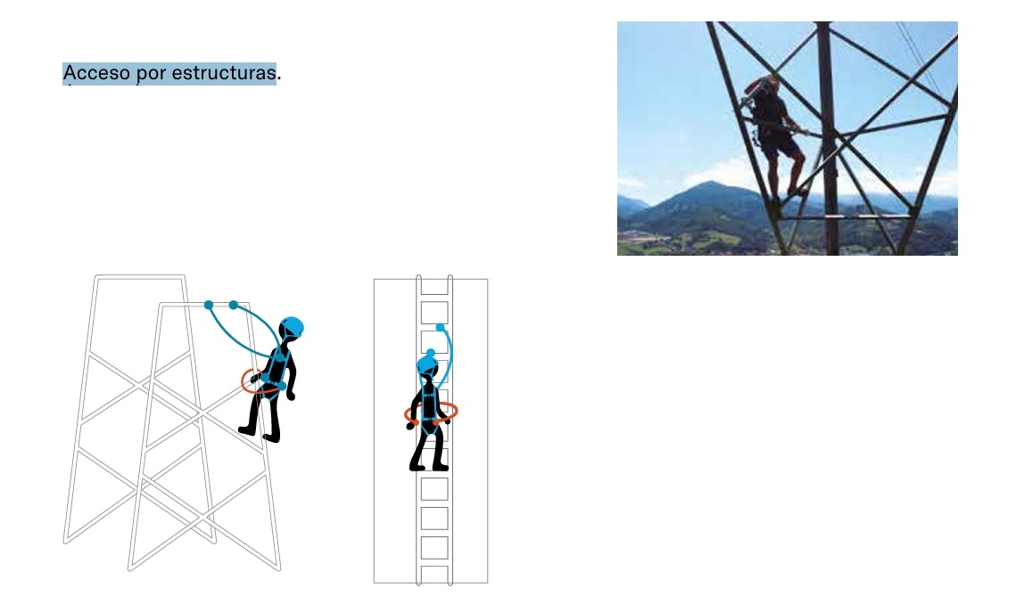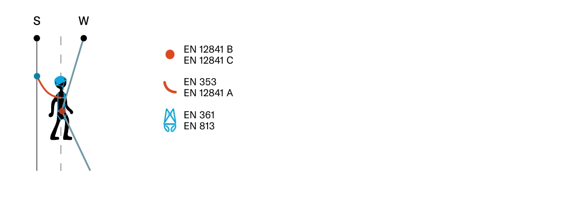 Un sistema de acceso mediante cuerda permite al usuario trabajar en suspensión, permitiendo su ascenso y descenso en la línea de trabajo (W). El sistema de acceso deberá ser complementado con una línea de seguridad (S) que incorpore un sistema anticaídas.
