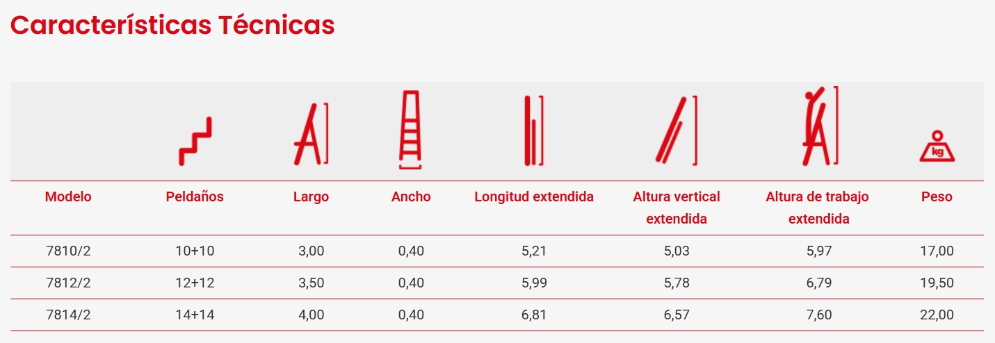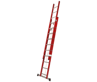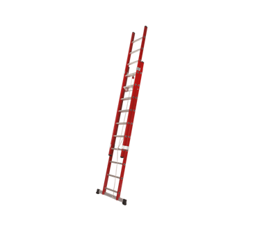 Escalera de dos tramos unidos mediante abrazaderas cuyo deslizamiento se produce mediante polea y cuerda. Peldaño cuadrado 30mm, perfil 67mm y  estabilizador con tacos de goma.  Fabricada según norma UNE-EN 131. Conforme el ensayo eléctrico 6.5.1. de la norma EN 61478: 2002. Trabajos en tensión escalera de material aislante. Tensión de ensayo 91 KV.