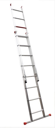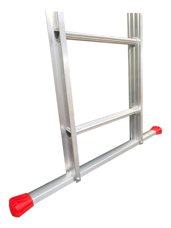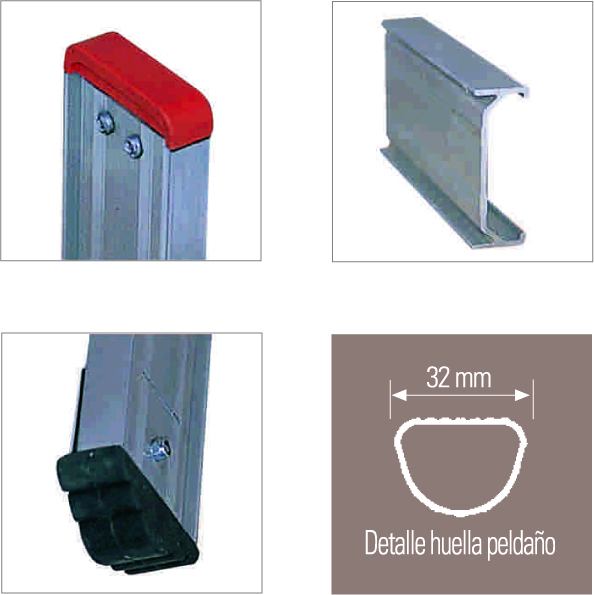 Escalera ligera de extensión manual con ganchos. Peldaño de 32mm con corrección de inclinación. Montante de perfil abierto de 64mm. Fijación ALFLO extra-fuerte.