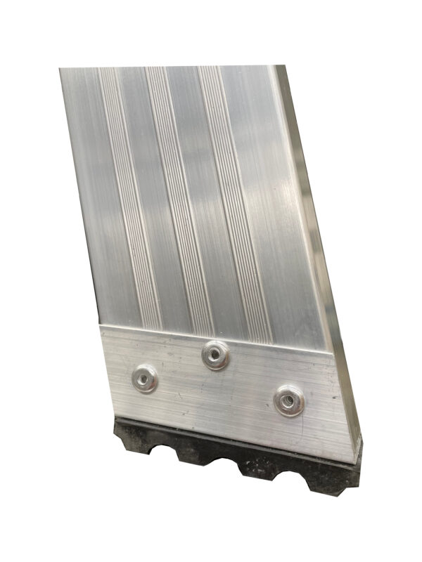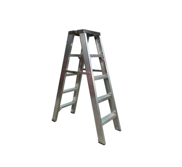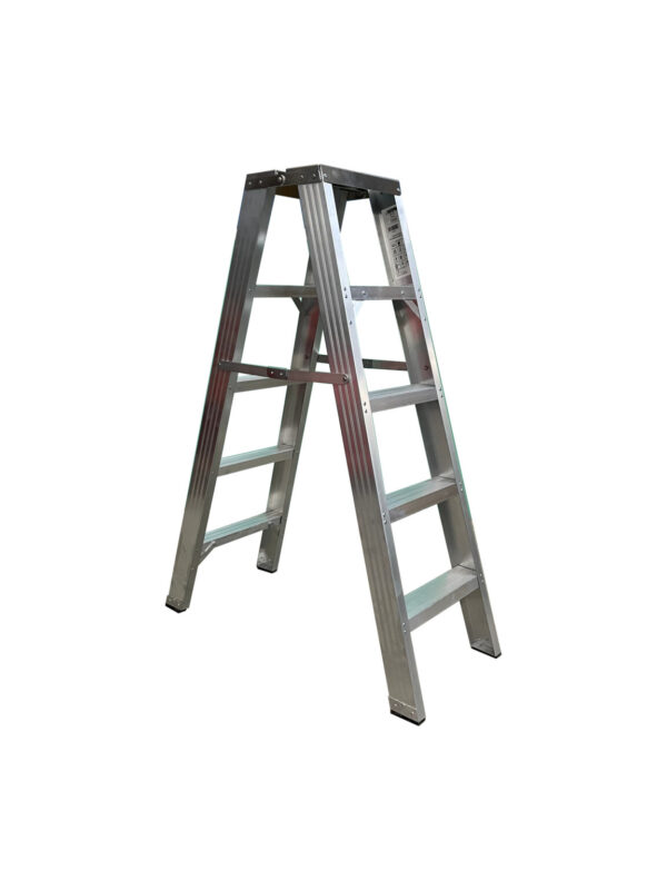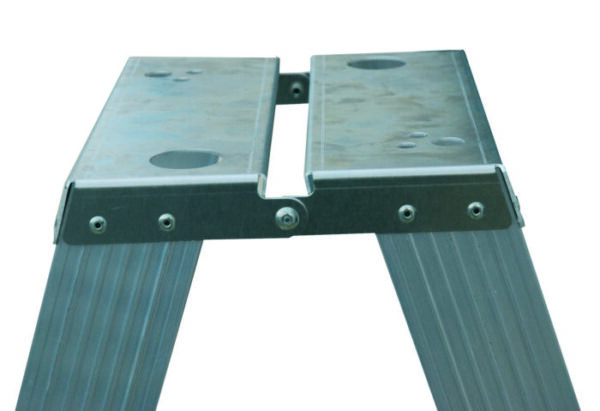Escalera de tijera industrial de doble acceso. Sustituta de la antigua y pesada escalera de madera. Peldaños planos de 78mm de huella y doble remache en cada uno. Pies de goma antideslizantes y tirante metálico. Plataforma metálica con orificios para dejar herramientas con seguridad. Montante de perfil abierto de 79mm.