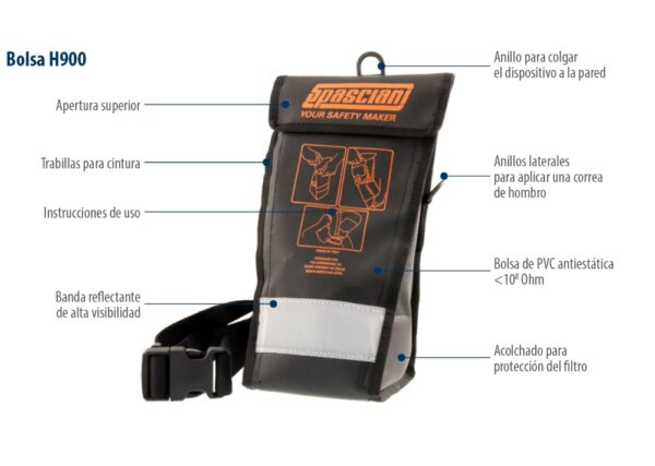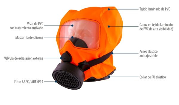 Los capuces de escape SPASCIANI serie H 900 ABEK 15 y H 900 ABEKP 15 están diseñados para escapar de plantas industriales donde los accidentes provocan la formación repentina de sustancias tóxicas, como gases y vapores orgánicos e inorgánicos, dióxido de azufre, ácido clorhídrico y otros gases, amoniaco y sus derivados y polvos, humos y nieblas.